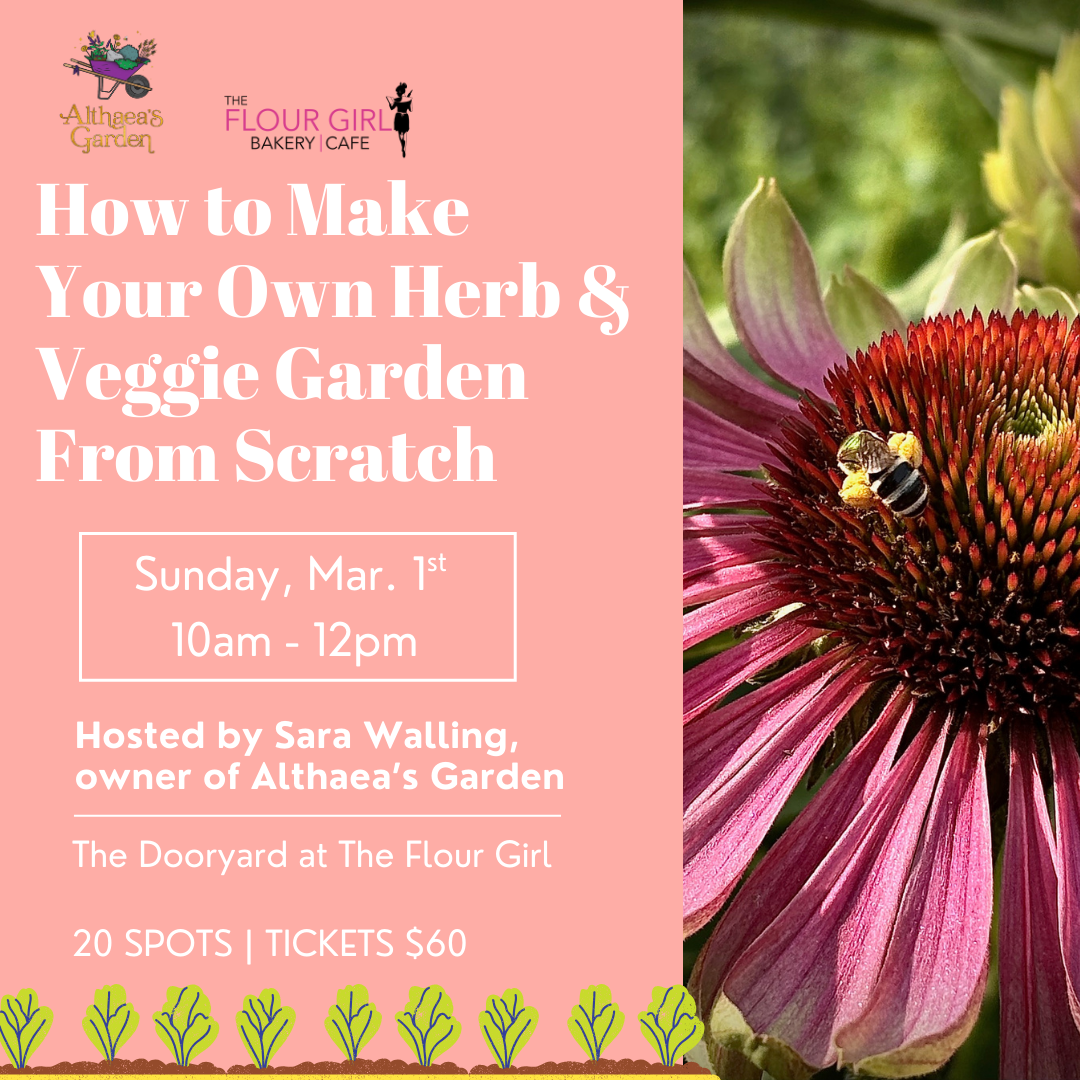 Learn how to make your own herb and veggie garden from scratch with Sara Walling, owner of Althaea’s Garden LLC. March is the perfect time to start your gardens from seed! Whether growing indoors under lights or outdoors, there are tried-and-true techniques to help you achieve the best success— every plant has its own methods for getting its roots. This 2-hour event will take it back to basics: soil, seed, water, and light, with light breakfast and coffee included. Each participant will leave with a small starting tray of seeds ready to go!